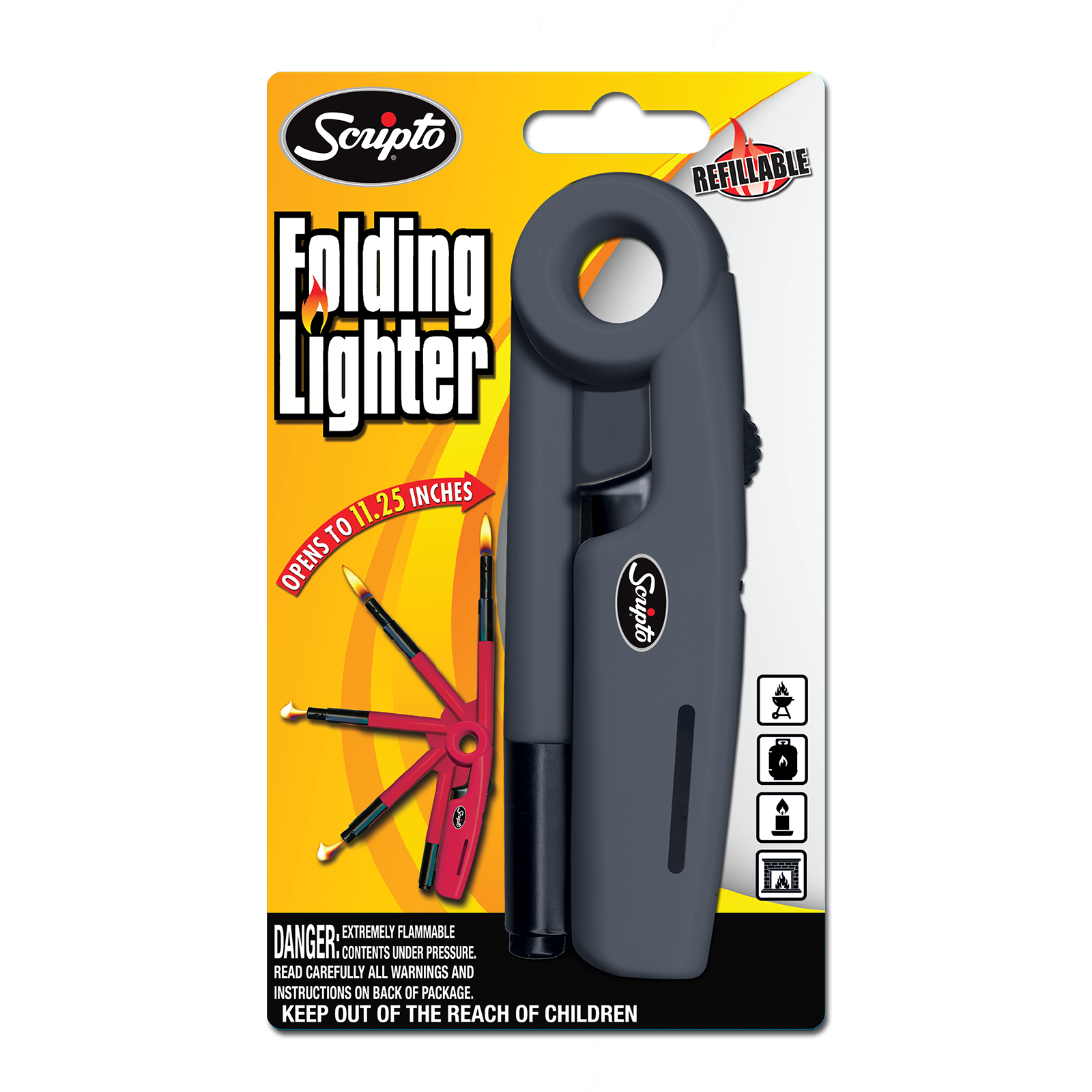 The refillable Scripto® Folding Lighter folds into a compact 5.5” lighter allowing for easy storage in small compartments, kitchen drawers and backpacks. The folding nozzle conveniently lights in multiple positions. The Scripto® Folding Lighter is perfect for indoor lighting, hiking, camping, picnics and other outdoor activities. Scripto® Butane is available. Also available in a space-saving short card.